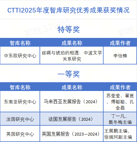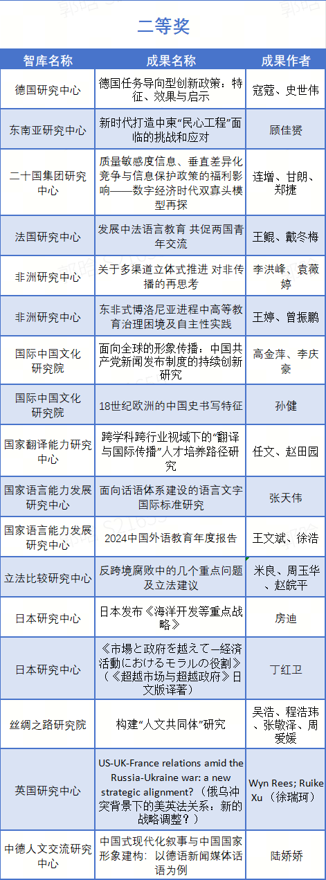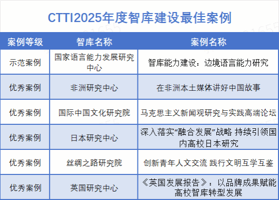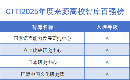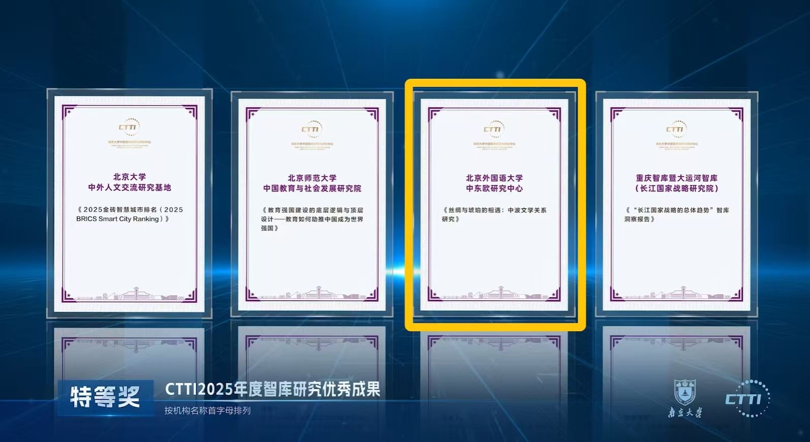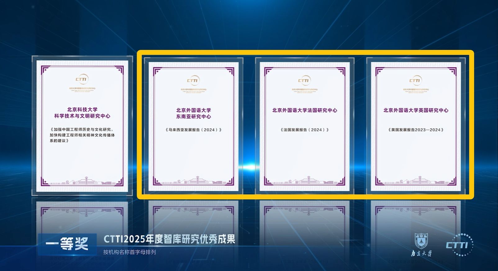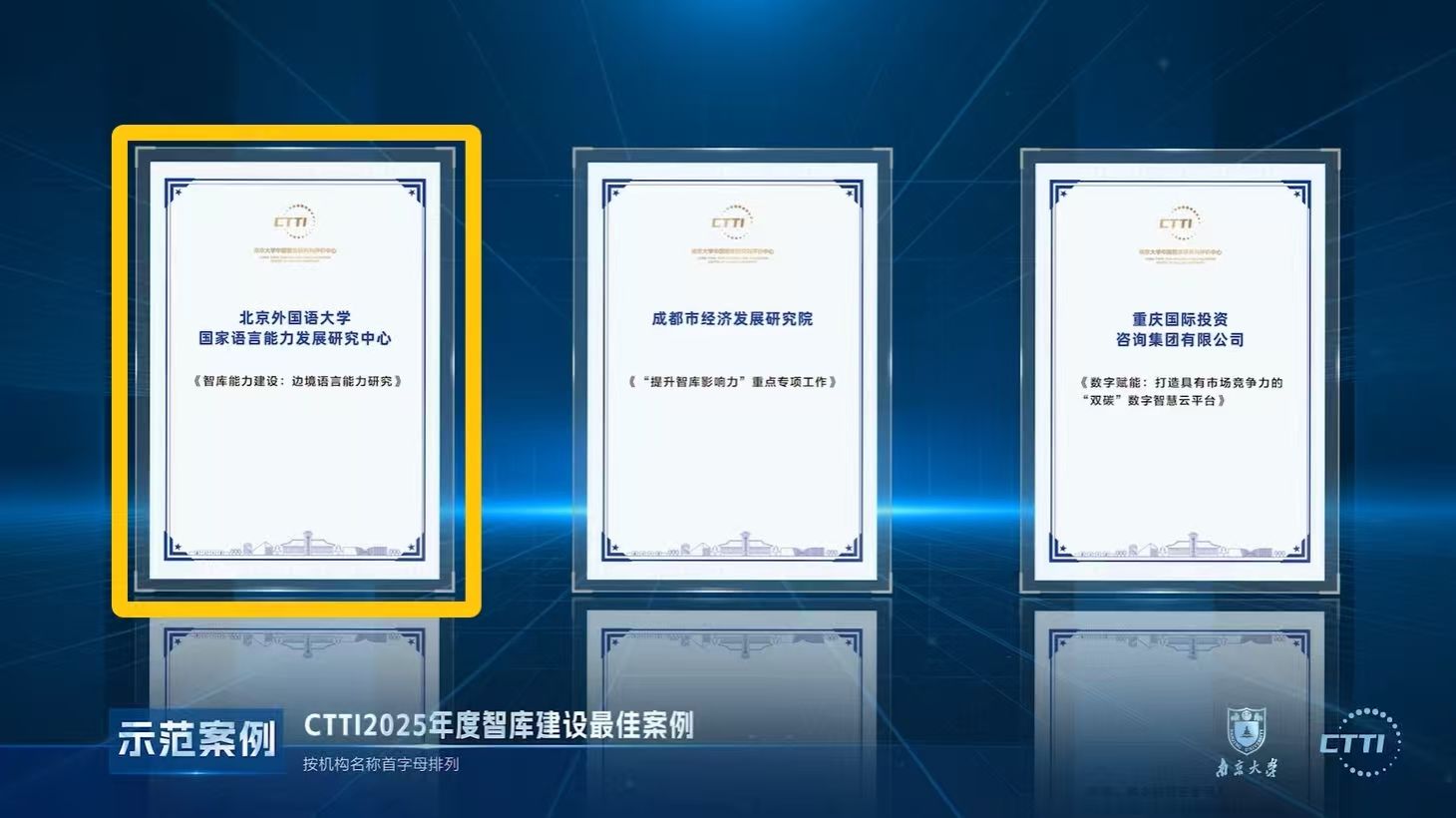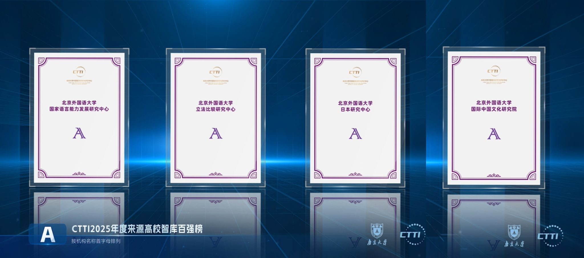11月21日,由南京大学主办,南京大学中国智库研究与评价中心承办的“2025新型智库治理论坛”成功举行。论坛公布了CTTI 2025年度智库建设最佳案例、优秀研究成果的征集与推介结果以及CTTI 2025高校智库百强榜。北京外国语大学6个研究中心申报的案例均入围最佳案例,其中示范案例1个,优秀案例5个;14个研究中心申报的21项成果入选智库研究优秀成果,其中特等奖1个,一等奖3个,二等奖17个;国家语言能力发展研究中心、立法比较研究中心、日本研究中心、国际中国文化研究院4个机构入选高校智库百强榜A类。具体获奖情况如下: